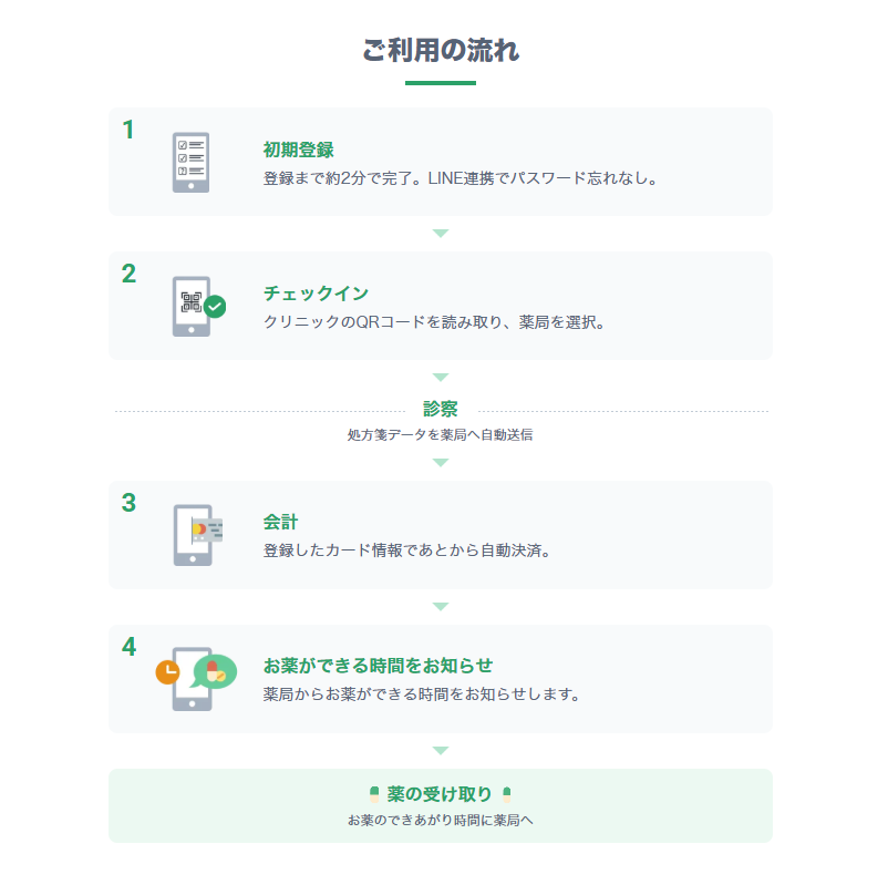 クレジットカードを事前登録してお財布要らずで診察代をネット決済できたり、ご指定いただいた薬局で薬の準備ができるとLINEで通知が受け取れるため、忙しい患者様や、現金以外でのお支払い希望の患者様、滞在時間が短い方が安心な患者様にとって、便利にご活用いただけるものとなっております。