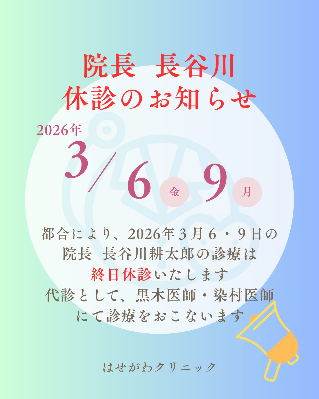 長谷川院長 診療休診に伴う代診のお知らせ 医師の都合により、2026年3月6,9日の2日間は終日、院長 長谷川の診療は休診とさせていただきます。 代診として下記の通り診療を行います 3月6日(金) 午前:黒木崇文医師、午後:染村祥医師 3月9日(月) 午前:染村祥医師・宇野将太医師、午後:黒木崇文医師 ご迷惑をおかけしますが、ご了承ください。 院長 長谷川 耕太郎 #はせがわクリニック #入間市 #狭山市 #循環器 #循環器内科 #休診のお知らせ #代診のお知らせ