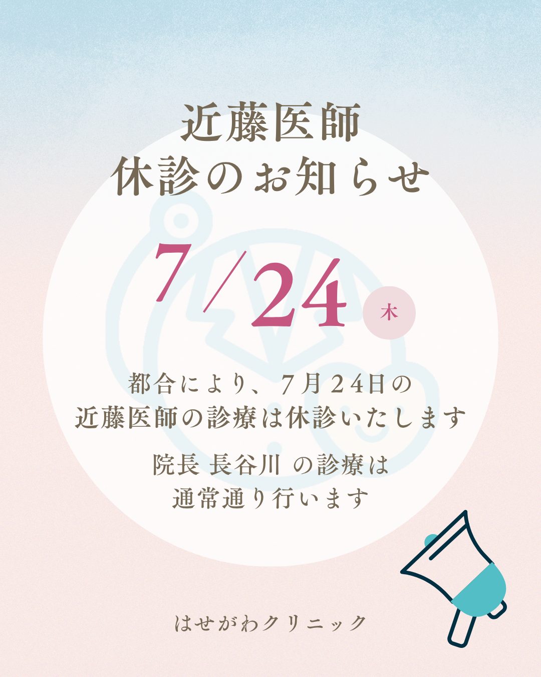 7月24日(木)近藤医師休診のお知らせ 7月24日(木)の近藤医師の診療は都合により休診といたします。 院長 長谷川 の診察は通常通り行います。 ご迷惑をおかけしますが、どうぞよろしくお願いいたします。 はせがわクリニック 院長